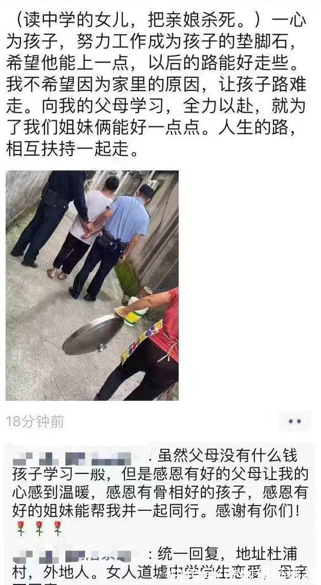 10月15日,有网传信息称,浙江绍兴杜浦村一名中学女生将其母亲杀害。