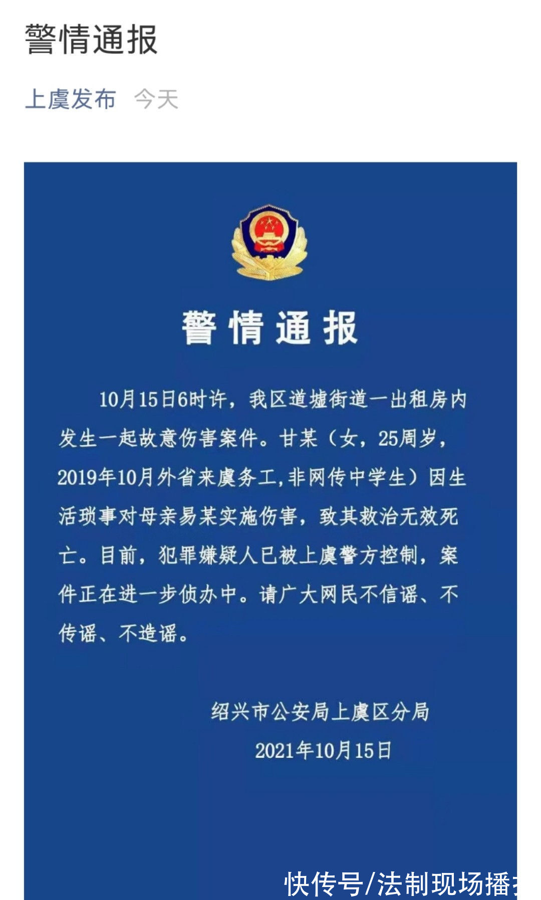 浙江绍兴警方通报女子伤害母亲致死案:嫌犯25岁